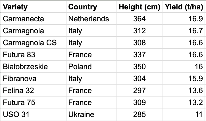 STANDING TALL: Key indicators for a number of main European fiber hemp varieties in plant top and tons per hectare of dry mass yield. Industrial hemp yields range extensively relying on native elements resembling soil high quality, rainfall, temperature, and day-length circumstances, which differ considerably between northern Europe and extra southern manufacturing zones.