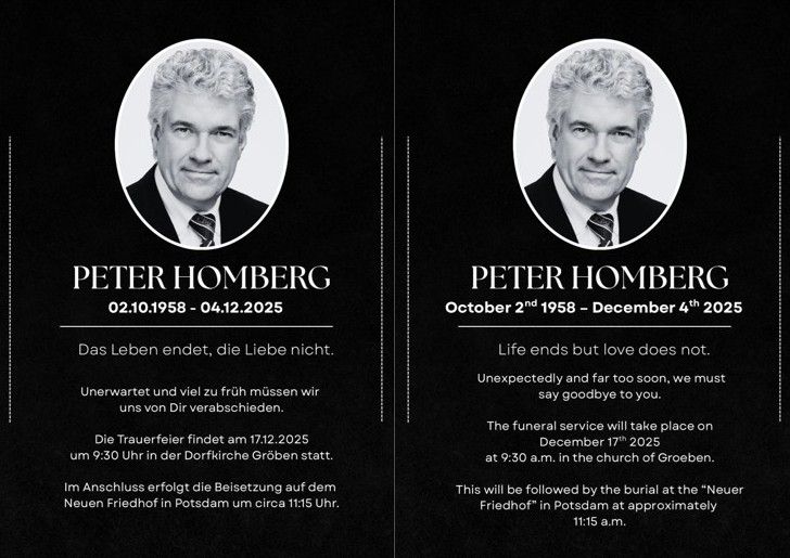 If you want to order flowers or wreaths for Peter Homberg’s funeral service, please contact Ms. Yvonne Stroschke, proprietor of the Landblume flower store, Hauptstr. 18, 14624 Dallgow-Döberitz. Telephone: 0175 6321 709, e mail: yvonnestroschke@gmail.com. Please word that you’ll be answerable for the price of the order.