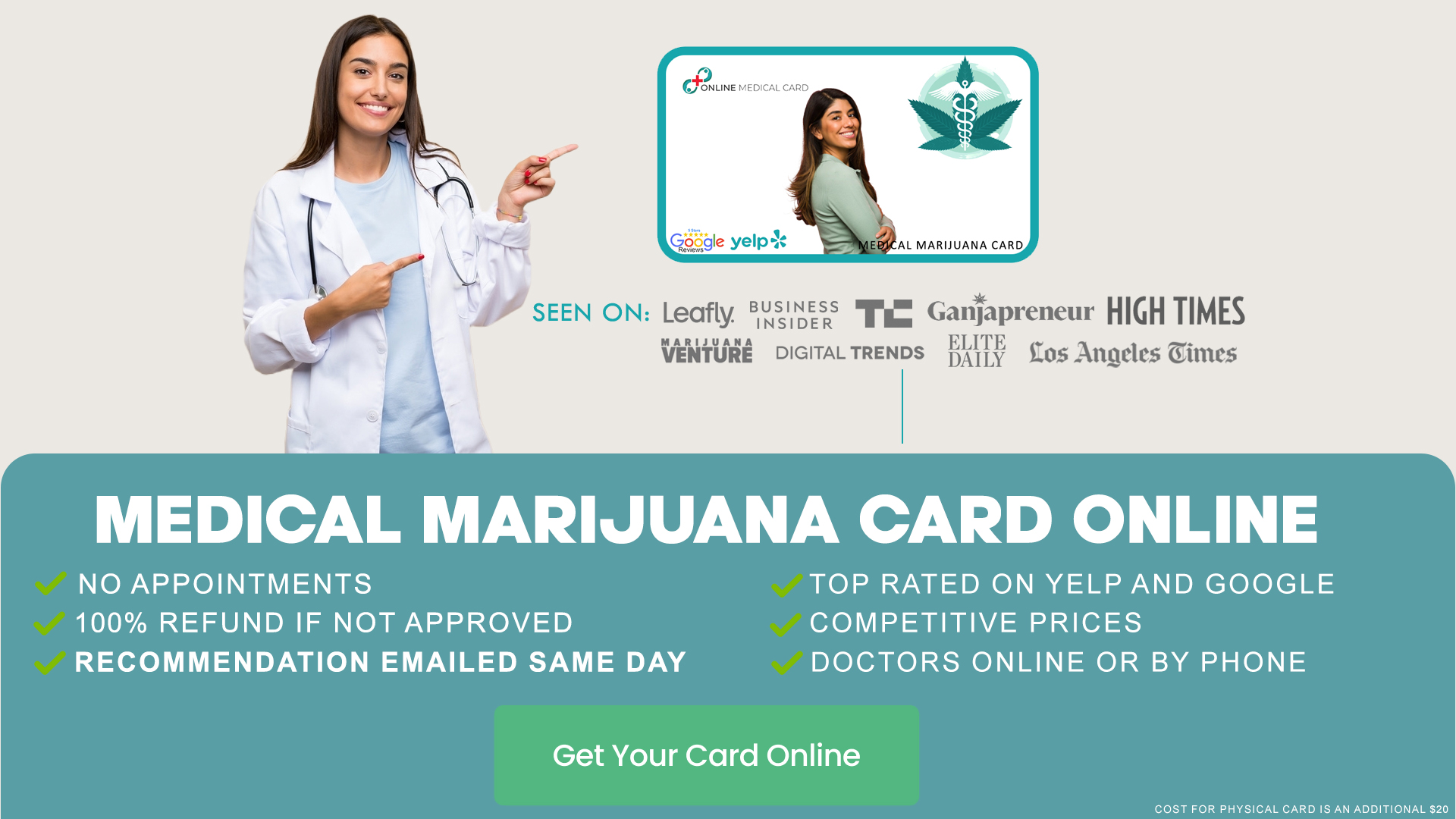 Our $20 marijuana card doesn’t embody the physician’s session charge, for those who additionally desire a bodily medical marijuana card, there’s a further $20 cost. This card shall be mailed out promptly upon request.