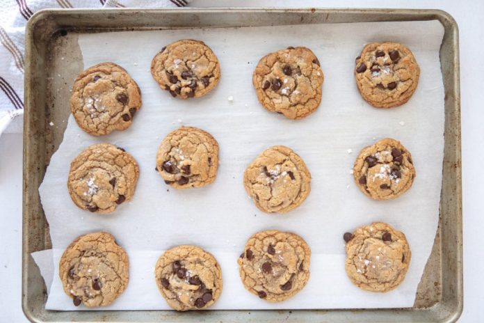 Place the dough balls on a parchment-lined baking sheet, and sprinkle with the flaked sea salt. I like to put one small ice cream scoop of dough on the baking tray, after which high it off with an additional 1/2 small scoop, for a superbly thick cookie.